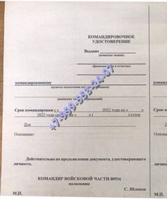 Заказать командировочное удостоверение военнослужащего в Евпатории можно и по иным причинам, например, необходимо срочно ехать на учения или в зону боевых действий. В таком случае следует обращаться к руководству с заявлением. Если человек потерял, или испортил документы, он может обратиться в нашу компанию. Купить командировочное удостоверение военнослужащего с доставкой мы предлагаем недорого.